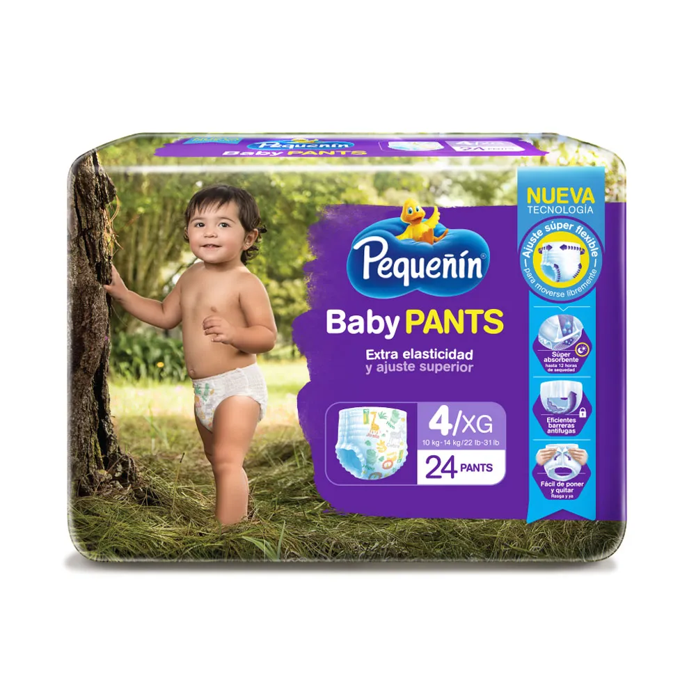 Cada paquete contiene 24 pañales Pequeñín Baby Pants, diseñados específicamente para la Etapa 4, ofreciendo protección ideal para bebés en crecimiento.