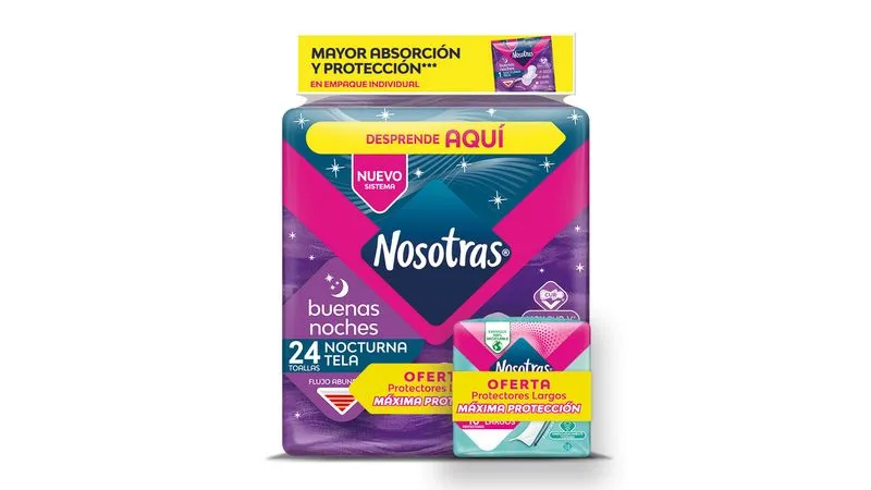 El paquete incluye 24 toallas higiénicas Buenas Noches y protectores largos para lograr máxima protección nocturna. Es ideal para cubrir necesidades durante los días más intensos del ciclo.